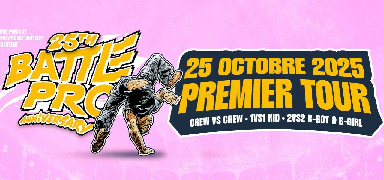 Depuis un quart de siècle, le Battle Pro, compétition 100% hip-hop, fait vibrer la scène internationale Breaking. Pour fêter le 25e anniversaire de cette compétition, c’est un événement exceptionnel que propose le Théâtre du Châtelet qui réunit les meilleurs B-Girls & B-Boys mondiaux. Encore plus électrique que d’ordinaire, cette compétition réunit plus d’une centaine de danseurs de renom, des juges reconnus à l’échelle internationale et des DJ’S et MC’S iconiques qui garantiront une ambiance survoltée, tout au long des différents battles, organisés en trois catégories : Crew vs Crew où les meilleures équipes s’affrontent pour la catégorie phare ; 2 vs 2 B-Girl & B-Boy avec des duels innovants et explosifs ; 1 vs 1 Kids parce que la jeune génération est prête à écrire l’histoire ! En somme, le Battle pro 25e anniversaire, ce sont des shows hip-hop exclusifs et des performances inédites qui renouent avec les fondamentaux du breaking, grâce à une scénographie à 360 degrés qui rappelle les cyphers des débuts du hip-hop.