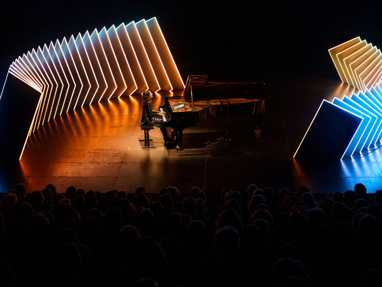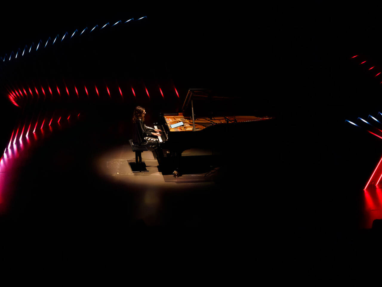 Entre piano et lumière : Vanessa Wagner interprète les Études de Philip Glass au cœur d’une scénographie du Collectif Scale.