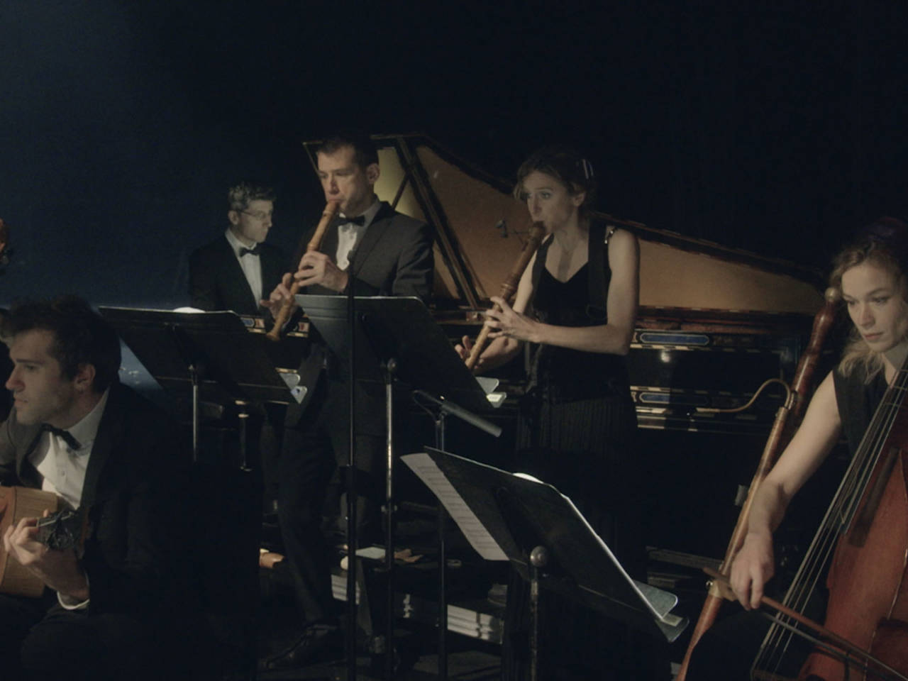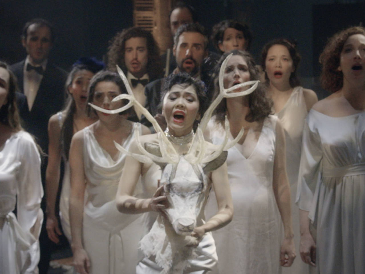 Geoffroy Jourdain, Benjamin Lazar et Corentin Leconte ont imaginé un film en plan séquence, à la frontière de l’opéra, du théâtre et du cinéma. Le mode de répétitions est une réponse à la crise sanitaire : du 4 septembre au 3 octobre 2020, Les Cris de Paris se sont associés aux festivals d’été qui n’ont pu accueillir les productions initialement prévues, pour des résidences de création et de médiation. En formation réduite d’une douzaine d’interprètes à chaque fois, ils ont interprété la musique d’Actéon, lors de répétitions publiques, commentées, d’ateliers de travail avec les publics des territoires des Festivals des Abbayes en Lorraine, de La Chaise-Dieu, Sinfonia en Périgord, du Midsummer Festival de Hardelot, et du Festival d’Ambronay. Les Cris de Paris ont ainsi traversé la France en format minimal (7 chanteurs et 6 instruments), réunissant à chaque fois des équipes différentes, et ont présenté un travail en cours, une étape dans la réalisation de cette production audiovisuelle, laquelle a été interprétée par l’ensemble des acteurs de cette tournée expérimentale (trente deux interprètes). Non seulement la musique mais aussi la dramaturgie ont pu s’affiner dans le contact avec les spectateurs : ainsi est née l’idée d’un prologue où un personnage (interprété par la comédienne Judith Chemla) préparerait le spectateur à l’histoire et le conduirait vers le temps mythologique.