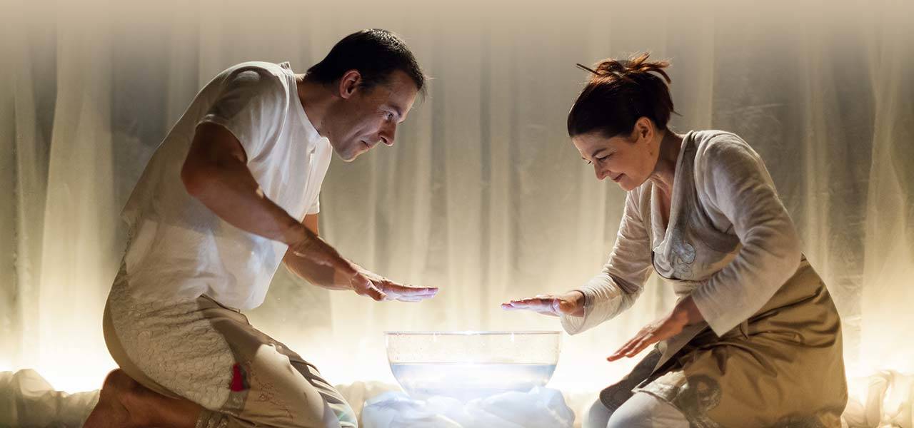 Après ANiMA la saison dernière, Florian Allaire et Florence Goguel présentent un autre poème visuel et musical pour les tout petits. À travers le symbole de l’eau et du cercle, ils questionnent le cycle de la vie. De la rondeur du tambour à la spirale en passant par la force centrifuge, les formes et les mouvements résonnent avec les jeux d’eau, les chants et les rythmes. La poésie s’invite pour faire sonner les mots comme des notes de musique, comme si le cercle de la lettre « O » se remplissait d’eau…